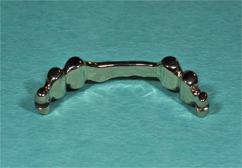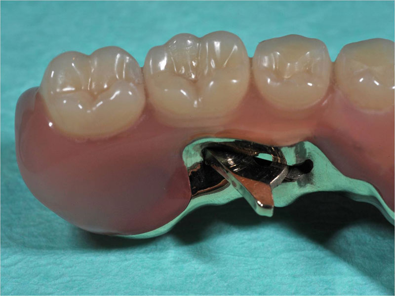 | Hier bieten vier Implantate eine relativ einfache Möglichkeit eine Prothese mit zwei Riegeln optimal zu befestigen. Diese sind an der Prothese im geöffneten Zustand deutlich zu sehen, geschlossen bleiben sie selbst im Spiegelbild des Mundinnenraumes unsichtbar. Sie vergessen alle Druckstellen und Ängste und freuen sich endlich wieder einmal richtig abbeissen zu können! |