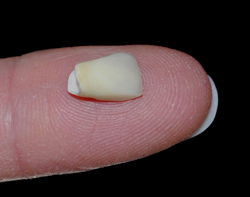 Foto einer metallfreien Einzelzahnkrone, die in unserem Praxislabor gefräst und verblendet wurde.